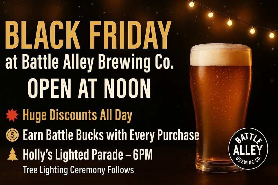 Black Friday just got a whole lot better. Join us for a full day of huge savings, Battle Bucks rewards, and holiday cheer as our beautiful downtown kicks off the Dickens Festival! Special beer and Cider releases to go with our always amazing food menu!